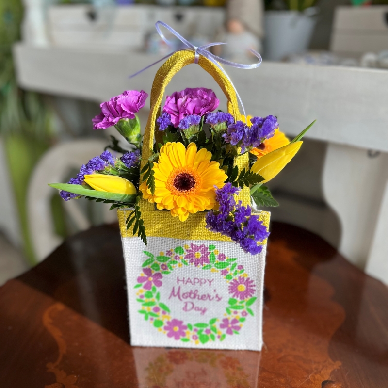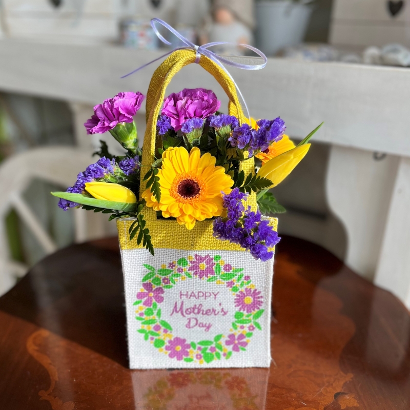 A lovely petite arrangement in a lined hessian bag, of bright and cheerful blooms.