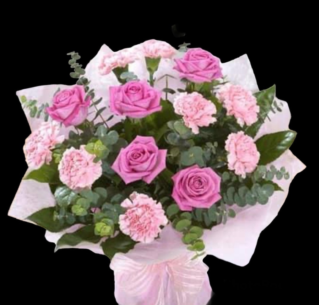 A perfect way to say happy Mother's Day with our 6 pink roses and 9 pink carnations topped off with some eucalyptus.
